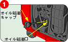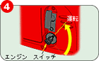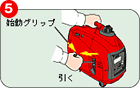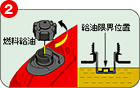 | オイル給油口に4サイクルオイルを供給します。 | 燃料給油キャップを外し、注入口のレベル(給油限界位置)までガソリンを供給します。 | 燃料給油キャップつまみを"開(ON)"の位置に合わせます | エンジンスイッチを"運転"の位置に合わせます。 | 始動グリップを引いて重くなる所をさがし、グリップを勢いよく引くとエンジンがかかります。 |
