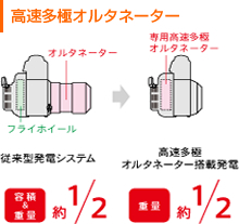 Honda独自の新発電システム「高速多極オルタネーター」をエンジン部に組み込むことで、従来の発電システムの約1/3の軽量化に成功。全体として約1/2の超軽量・コンパクト化を実現しました。 だから、使用機器を選ばない高品質な電気を供給します。 マ一般の男性2人で、トラックの荷台に持ち上げられる重量の限界は、約80kgといわれています。従来まではクレーンを使ったり、多くの人数で積み降ろしをしていた100kgを超える3kVAクラスの発電機も、EU28isなら2人で簡単に積み降ろしが可能です。 |