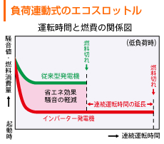 使用負荷に見合ったエンジン回転数を自動制御する「エコスロットル」を標準装備して、実用域でのさらなる低燃費を実現。またエコスロットルと二十防音構造の採用で、ヨーロッパの厳しい騒音規制(EN)をクリア*した低騒音です。 だから、実用域での低燃費・低騒音を実現します。 エコスロットルは連続運転時間の大幅な向上と、実用域での優れた低燃費を実現。必要な量だけの燃料しか使用しないので何度も補給する手間が省け、また、使用機器が低負荷の場合にも最小減に自動制御するので、省エネ&低騒音にも効果的。起動電力の大きな機器などにも使用できます。 |