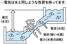水圧と同じように電気にも圧力があり、電圧と呼びます。