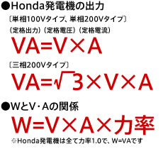 発電機が電気器具などに供給できる電力を、電気出力と呼びます。発電機の構造(単相か三相か)によって、電気出力の計算式は変わります。 ※Honda発電機のカタログには、定格出力を表すためにV・A(ボルト・アンペア又はブイ・エー)という単位を用いています。このV・Aの数値は図の関係式によって求められ、現在では発電機の出力表示として一般的になっています。